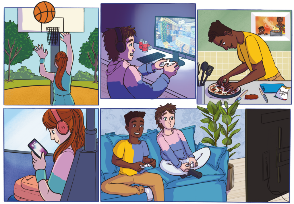 • Des illustrations narratives mettant en scène des situations du quotidien (ex : choix alimentaires, gestion du stress).
