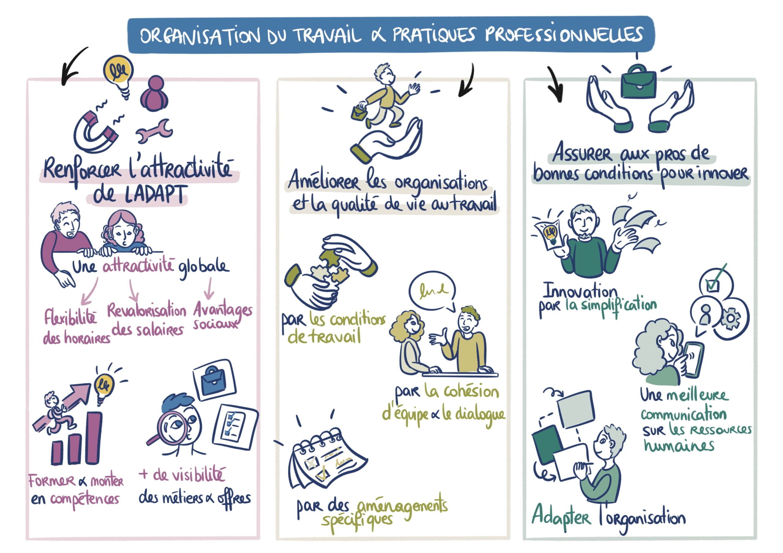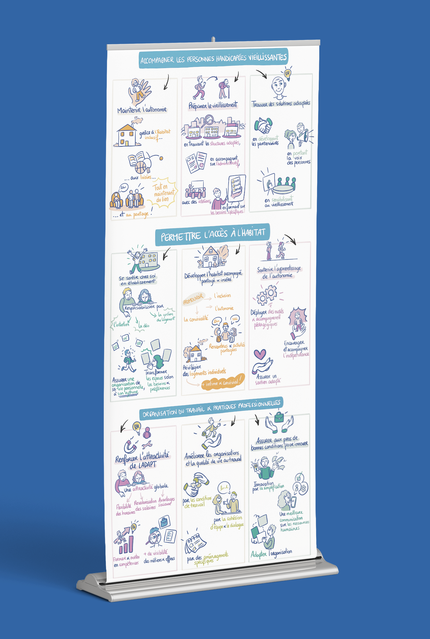 LADAPT Normandie déployait son nouveau projet stratégique national et régional, et avait besoin de le rendre plus lisible et motivant pour les équipes comme pour les publics accompagnés. J’ai été invitée à mettre en image les grandes orientations de ce projet, à partir des échanges et ateliers participatifs menés un peu partout dans la région.