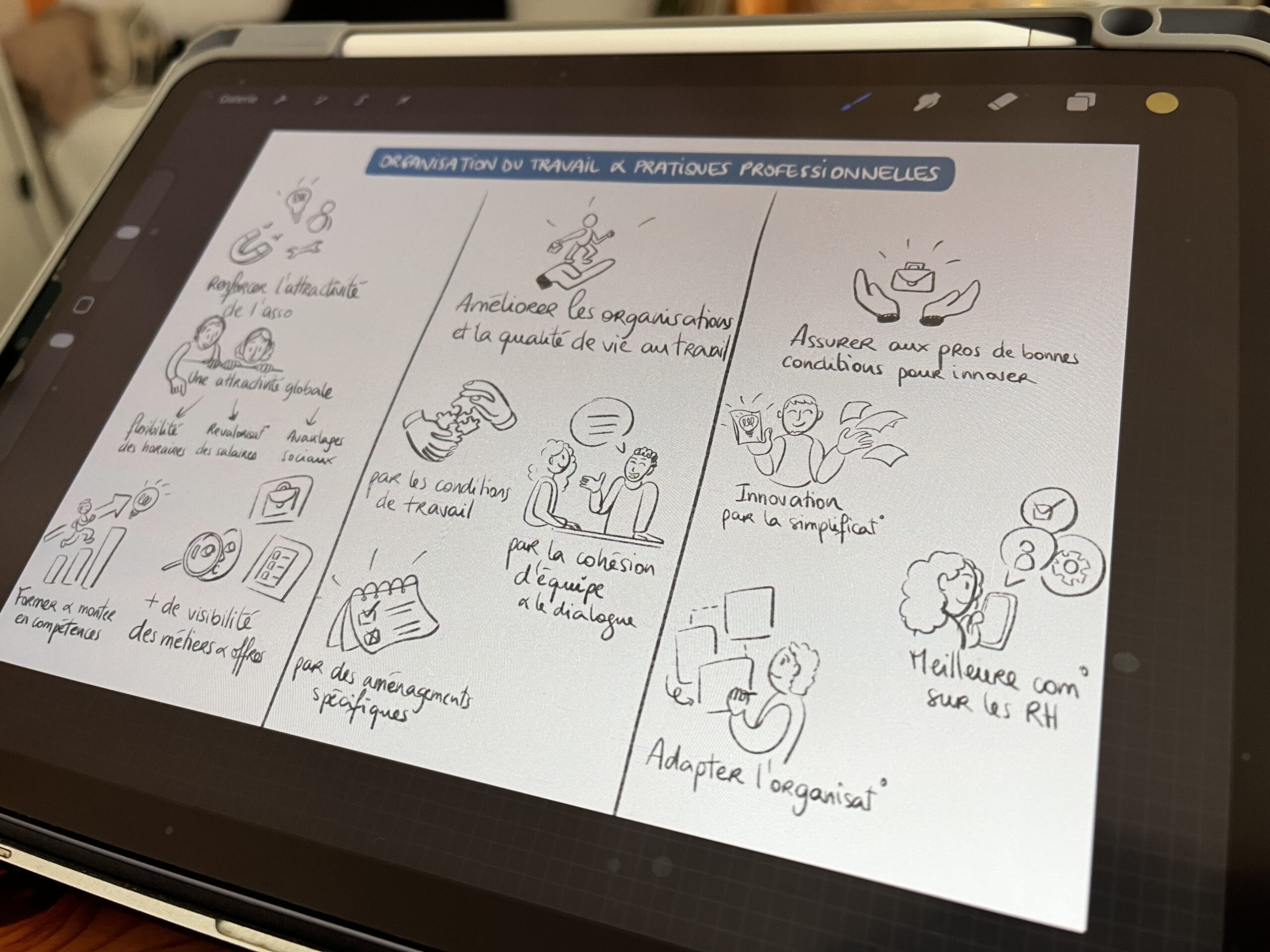 Pour commencer, j’ai décortiqué les comptes rendus d’ateliers pour faire ressortir les messages essentiels : ce que les équipes voulaient vraiment faire passer. À partir de là, j’ai conçu une structure visuelle simple et dynamique, avec des mots-clés, des personnages, des symboles et des liens logiques entre les idées — comme une carte mentale illustrée.
